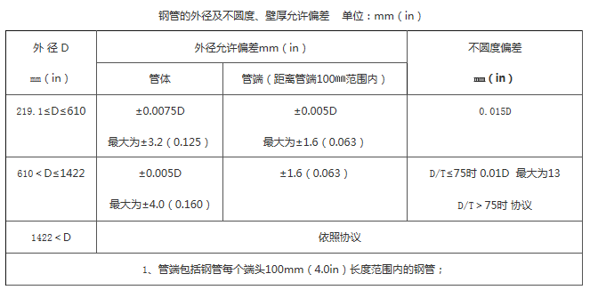 1、 如果訂貨合同規(guī)定的壁厚負偏差比本表給出的對應(yīng)數(shù)值小,則壁厚正偏差應(yīng)增加一些數(shù)值,以保證相應(yīng)的偏差范圍; 2、 壁厚正偏差不適用于焊縫區(qū)域; |