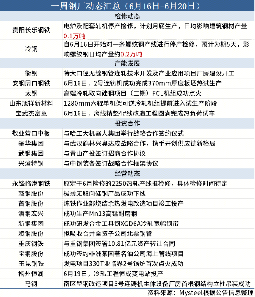據(jù)Mysteel不完全統(tǒng)計(jì),本周(6月16日-6月20日)2家鋼廠發(fā)布檢修信息,具體如下: