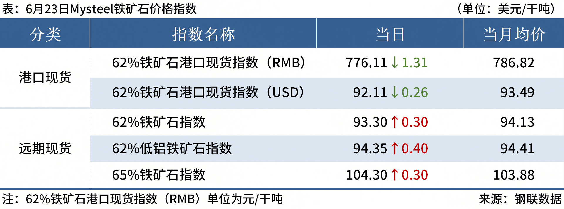 ◎ 6月23日,全國主港鐵礦石成交118.20萬噸,環(huán)比增52.1%;237家主流貿(mào)易商建筑鋼材成交10.30萬噸,環(huán)比增5.6%。