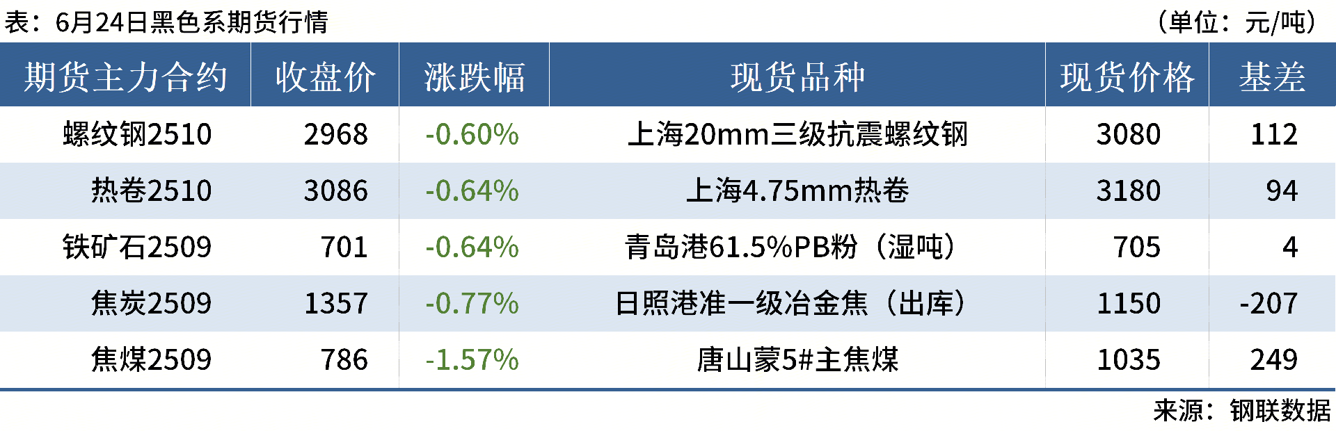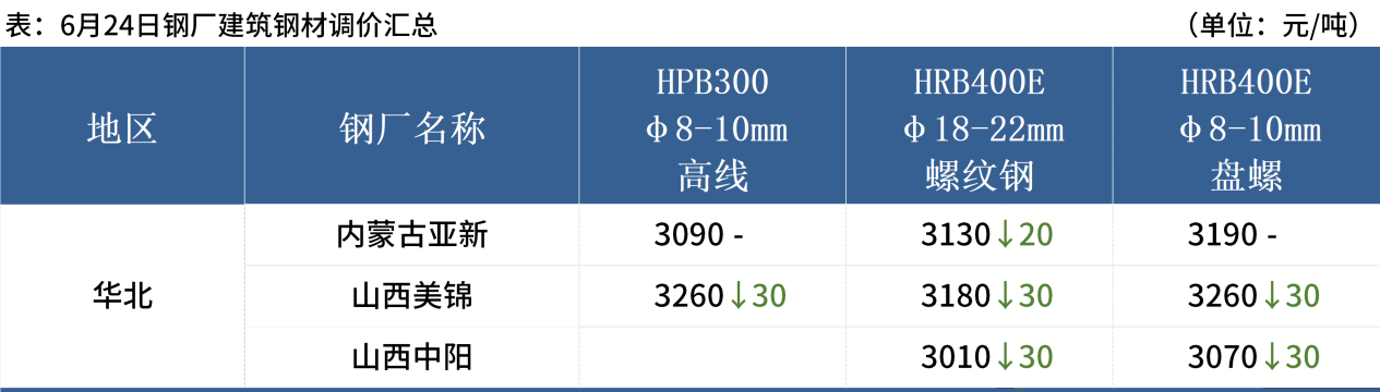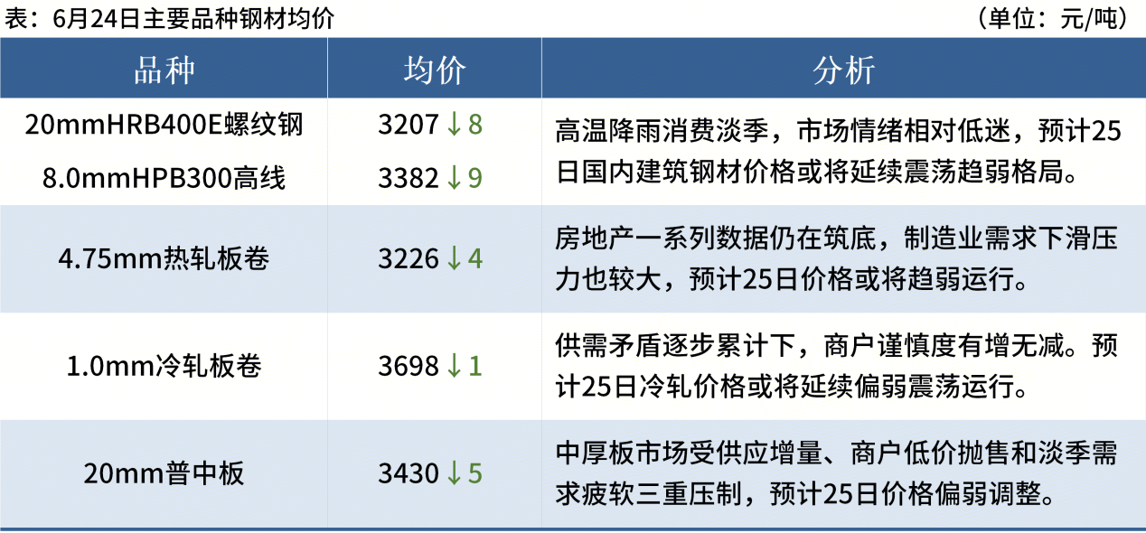 ◎ 6月24日,全國主港鐵礦石成交81.30萬噸,環(huán)比減31.2%;237家主流貿(mào)易商建筑鋼材成交9.32萬噸,環(huán)比減9.5%。