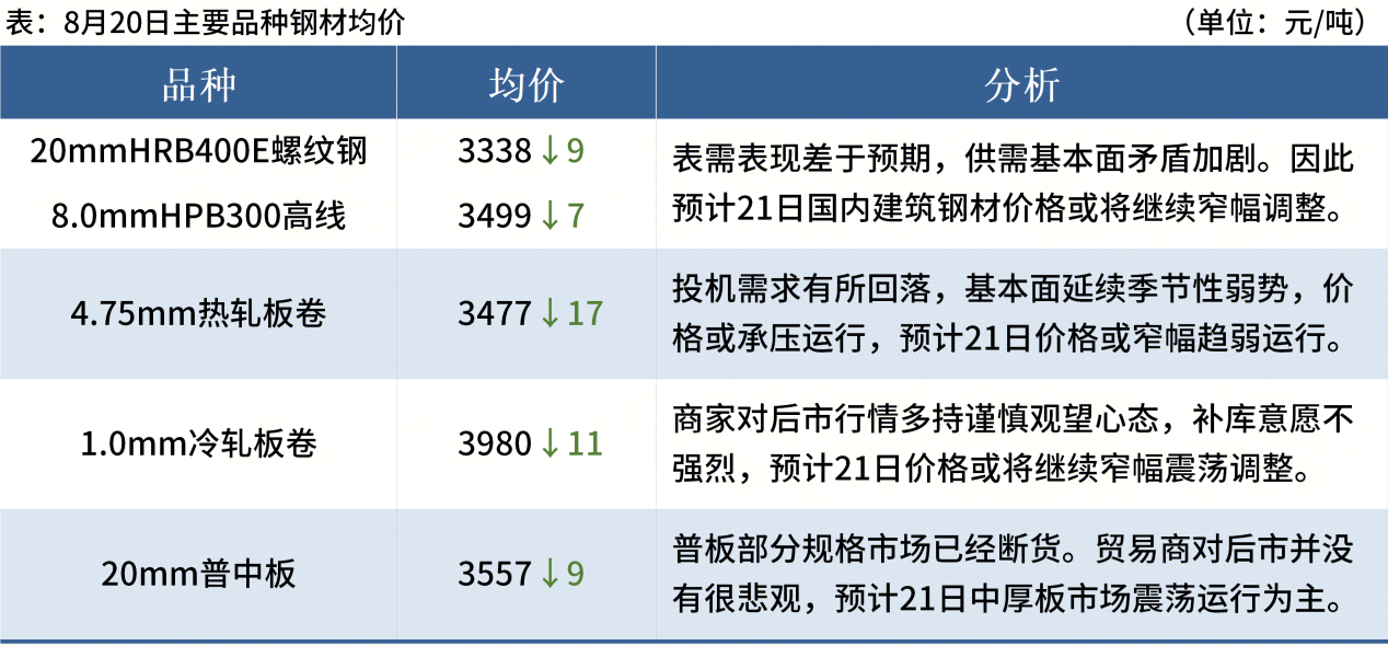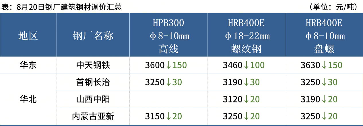 ◎ 8月20日,中天鋼鐵出臺8月下旬價格,螺紋鋼下調(diào)100元/噸,線材盤螺下調(diào)150元/噸。