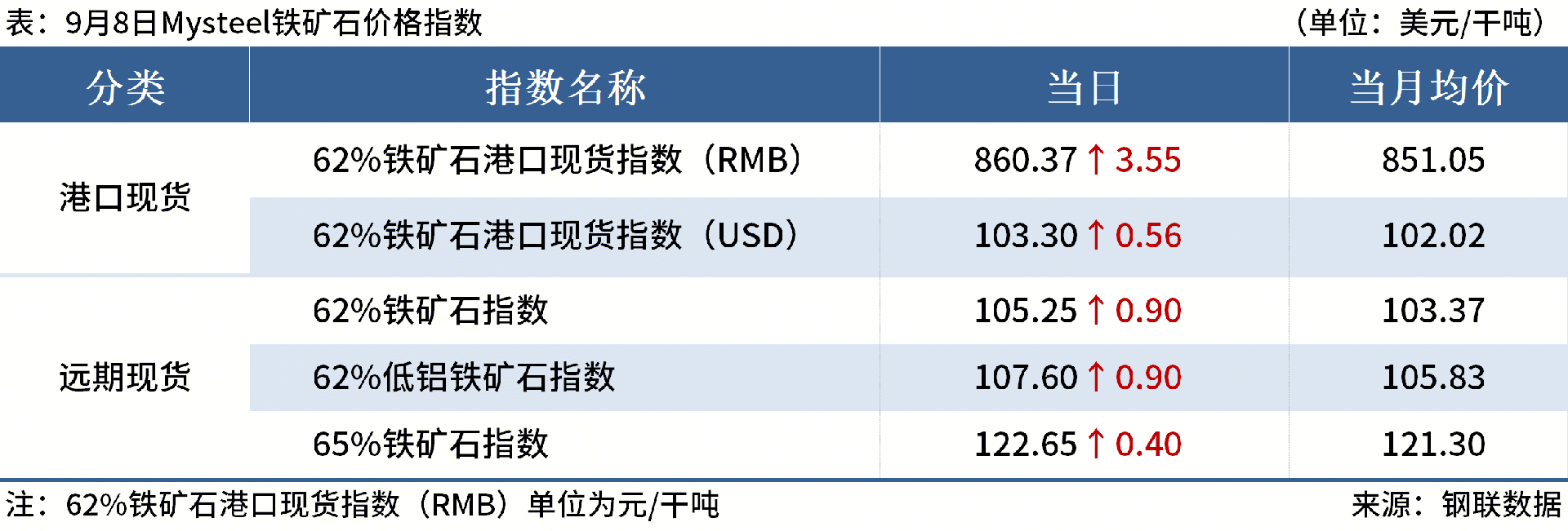 ◎9月8日Mysteel進(jìn)口鐵礦石62%澳洲粉礦遠(yuǎn)期現(xiàn)貨指數(shù)105.25,漲0.9,月均103.37;65%巴西粉礦遠(yuǎn)期現(xiàn)貨指數(shù)122.65,漲0.4,月均121.3。(單位:美元/干噸)