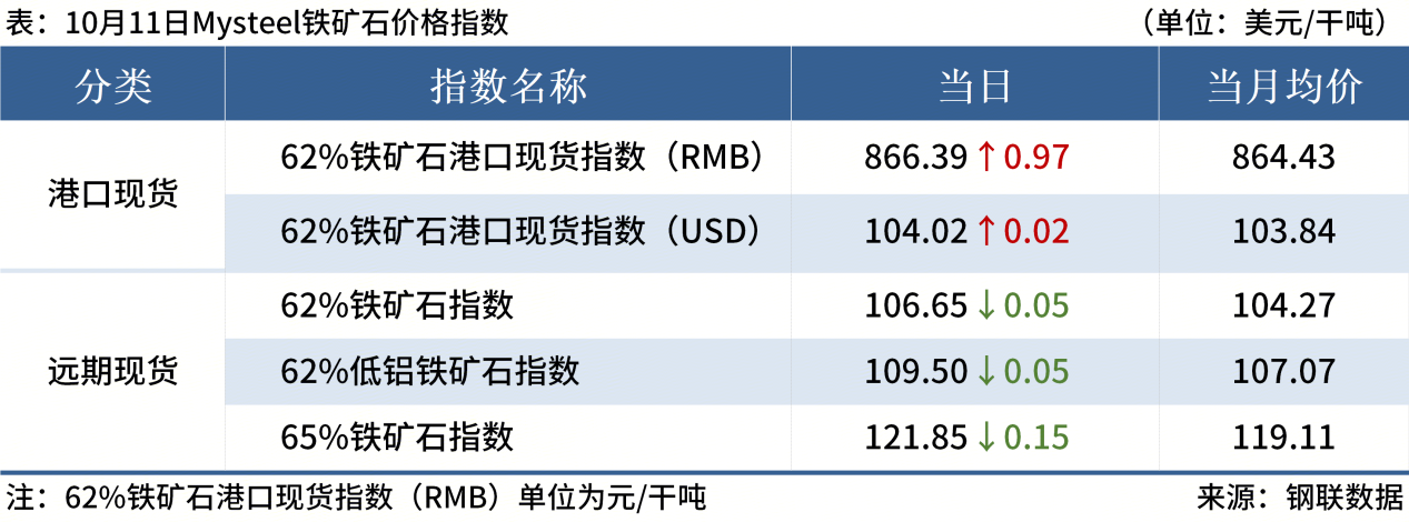◎ 10月11日,全國主港鐵礦石成交50.60萬噸,環(huán)比減58.3%;237家主流貿(mào)易商建筑鋼材成交9.14萬噸,環(huán)比減7.1%。