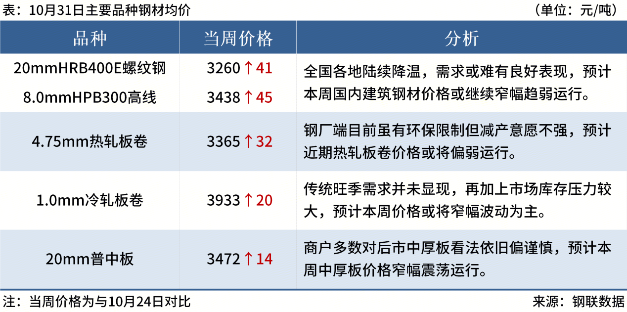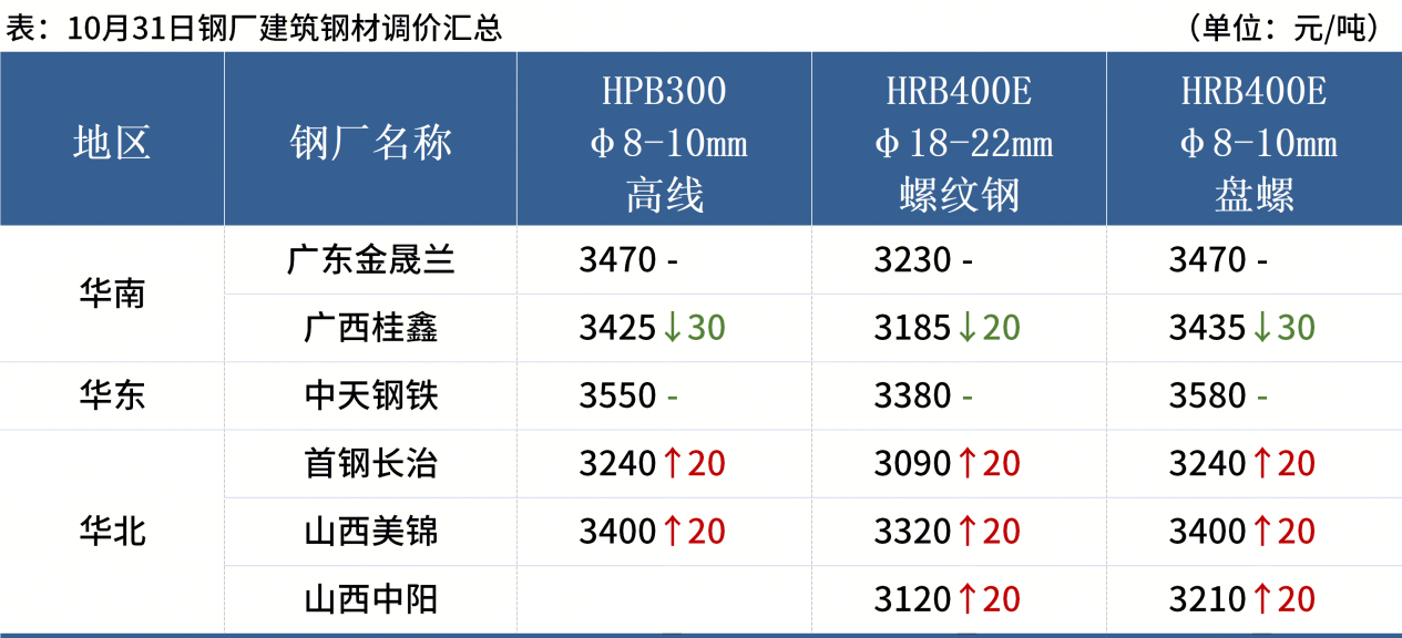 ◎ 江蘇永鋼出臺(tái)11月上旬出廠價(jià),螺紋鋼、線材、盤螺平穩(wěn),現(xiàn)螺紋鋼3400元/噸,線材盤螺3600元/噸。