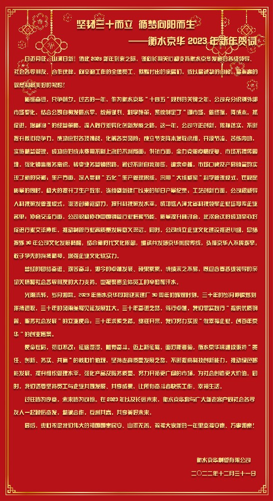 堅韌三十而立 賡續(xù)奮進 鑄夢京華2023年度衡水京華業(yè)務(wù)經(jīng)理大會在衡水京華勝利召開律回春暉漸、萬象始更新!2023年2月25日,衡水京華、鄭州京華、日照京華2023年度業(yè)務(wù)經(jīng)理大會在衡水京華制管有限公司隆重召開。衡水京華、鄭州京華、日照京華相關(guān)領(lǐng)導(dǎo)及業(yè)務(wù)經(jīng)理出席了本次會議。會議主題為“堅韌三十而立 賡續(xù)奮進 鑄夢京華”···